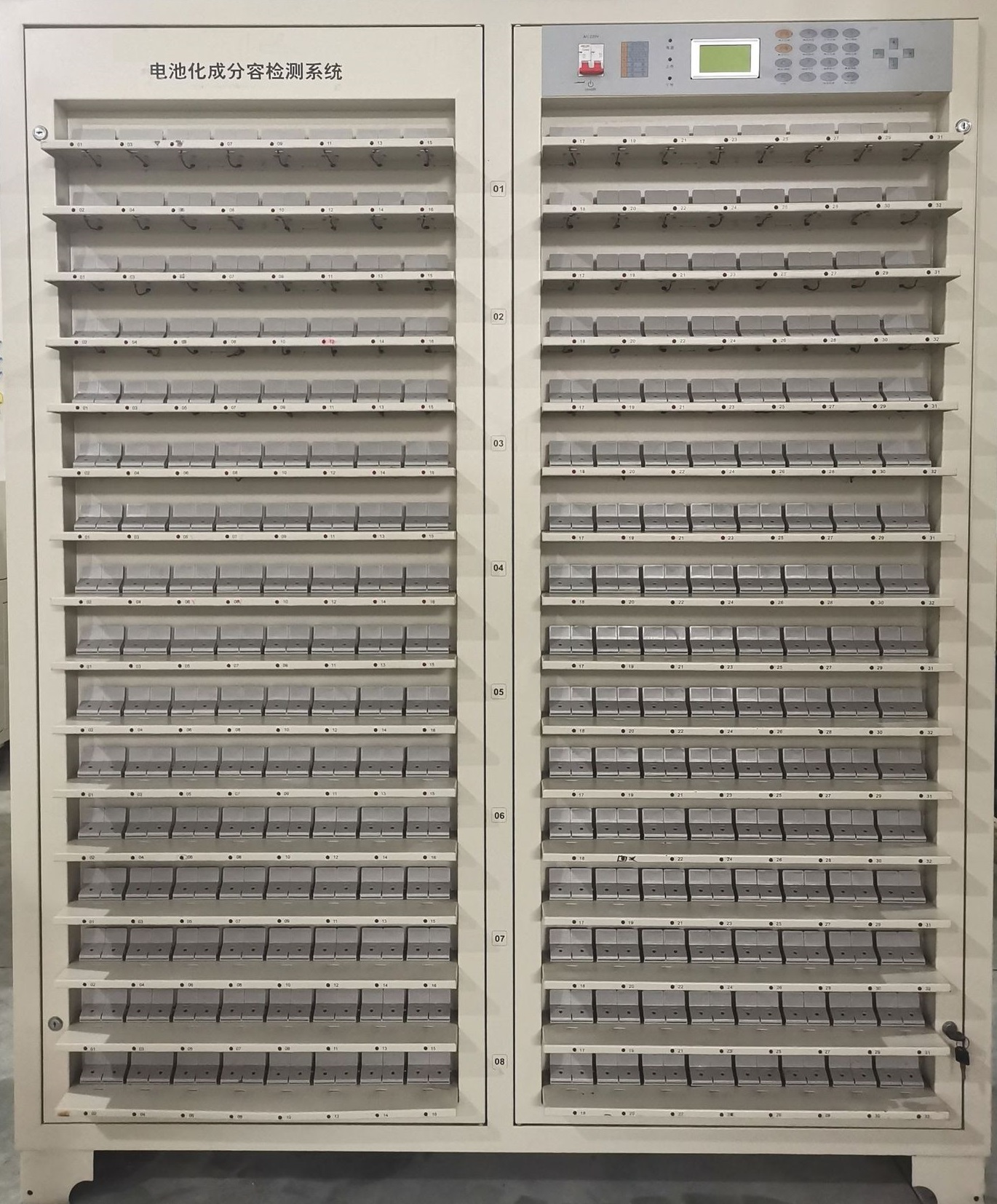 電池分容柜分為生產用和試驗用兩大類,生產用又分為圓柱,鋁殼和聚合物兩種類型,二者內部結構完全一樣只是夾具不同,圓柱與鋁殼采用上下針接觸,而聚合物則采用鍍金扁平夾具夾持極耳進行沖放.512個點完全共用,統一的電流與電壓,所以適合批量生產.實驗室用則每個點完全分開,可獨立工作,電流大,一臺機多數僅能控制8點左右.